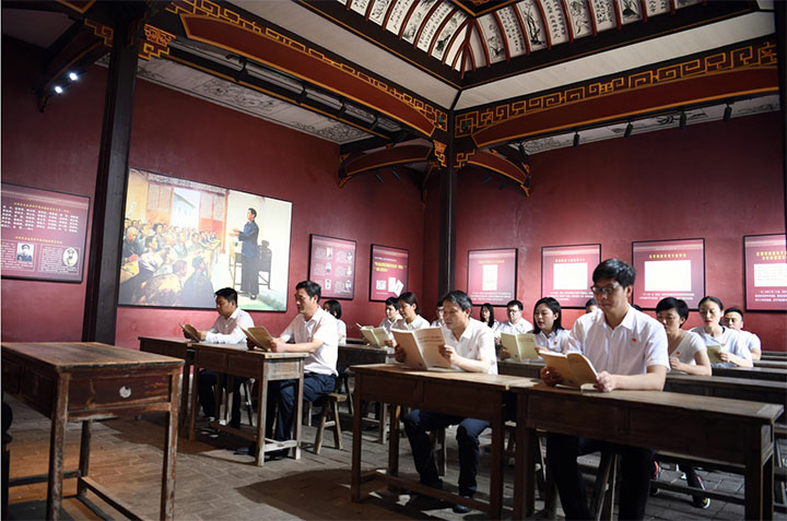 在興國縣蘇維埃政府所在地——瀲江書院,毛主席在這里舉辦了興國縣土地革命干部訓(xùn)練班,為中央蘇區(qū)的土地革命培養(yǎng)了第一批斗爭骨干,建立了興國縣第一個革命政權(quán)。大家在土地革命干部訓(xùn)練班舊址學(xué)堂內(nèi),集體誦讀了一段土地革命時期的歷史,當(dāng)朗朗書聲再次在書院響起,珍貴的革命記憶浮于腦海,激勵黨員們延續(xù)紅色根脈、傳承紅色基因。