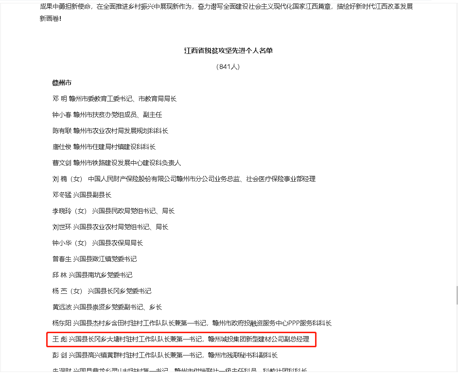 6月23日,省委、省政府召開全省脫貧攻堅(jiān)總結(jié)表彰大會(huì),表彰一批在打贏脫貧攻堅(jiān)戰(zhàn)中作出突出貢獻(xiàn)的個(gè)人和集體,其中,興國縣長岡鄉(xiāng)大塘村駐村工作隊(duì)隊(duì)長兼第一書記,贛州城投集團(tuán)新型建材公司副總經(jīng)理王彪獲“江西省脫貧攻堅(jiān)先進(jìn)個(gè)人”榮譽(yù)稱號(hào)。