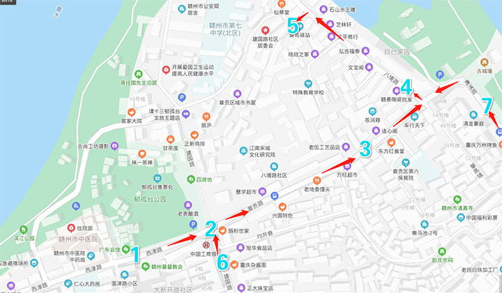 建議線路二:6建國(guó)路→2西津路與建國(guó)路、章貢路交匯紅綠燈→3章貢路→4八境路→5八境路支巷景區(qū)入口