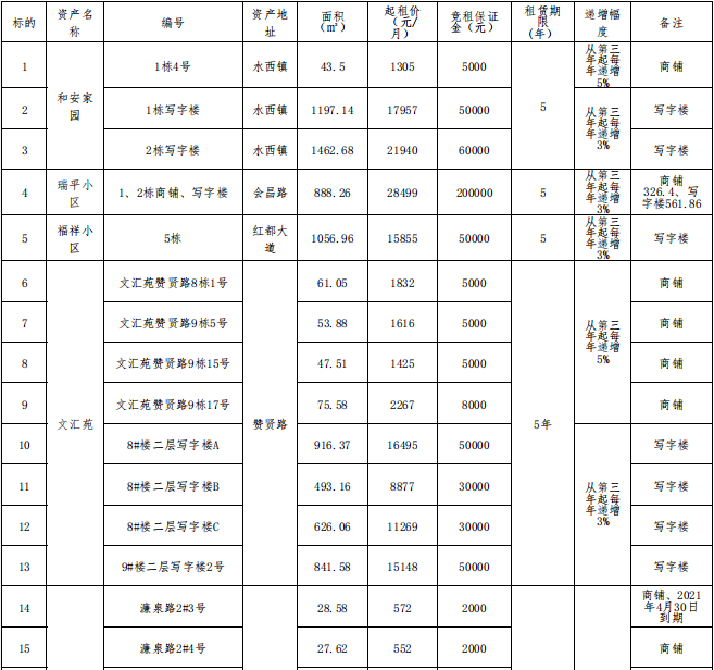 贛州振興實業(yè)有限責任公司委托江西江南拍賣有限公司,定于2021年5月28日10:00開始在贛州市公共資源交易中心(長征大道9號)進行國有資產公開招租,現(xiàn)歡迎符合條件的單位或個人前來報名參加競租。