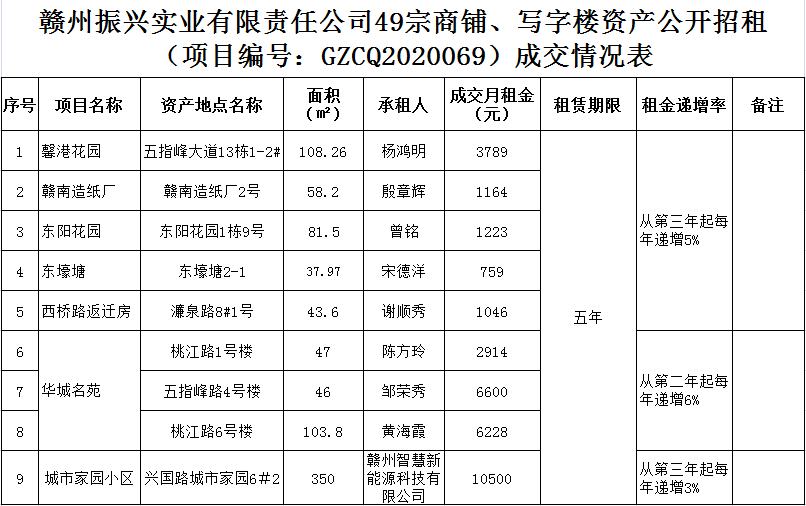 2020年10月27日上午10時(shí),在贛州市公共資源交易中心舉行的贛州振興實(shí)業(yè)有限責(zé)任公司49宗商鋪、寫字樓資產(chǎn)公開招租(項(xiàng)目編號:GZCQ2020069),現(xiàn)將公開招租成交情況公示如下: