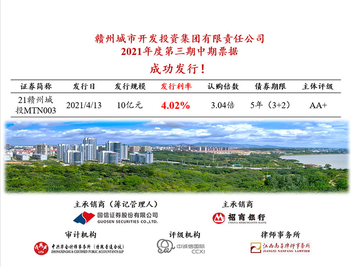 4月13日,贛州城投集團2021年度第三期中期票據(jù)成功發(fā)行,金額10億元,發(fā)行利率4.02%/年,創(chuàng)集團中長期債券品種利率新低,亦創(chuàng)近兩年全省同資質(zhì)同期限10億元以上公司債、企業(yè)債和協(xié)會產(chǎn)品的價格新低。同時該債券是贛州城投集團戰(zhàn)略發(fā)展部黨支部全體黨員黨史學習教育成果與業(yè)務成果的有力轉(zhuǎn)化。