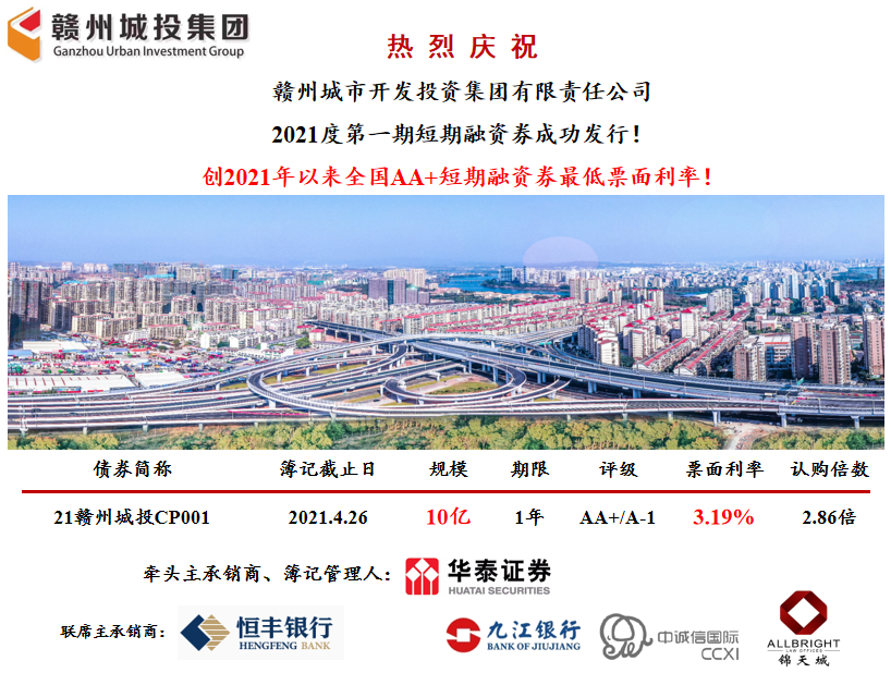 4月26日,贛州城投集團(tuán)2021年度第一期短期融資券成功發(fā)行,金額10億元,發(fā)行利率3.19%。該債券是2021年以來全國(guó)同主體評(píng)級(jí)AA+短期融資券最低利率,也是集團(tuán)戰(zhàn)略發(fā)展部黨支部黨員學(xué)黨史、悟思想、辦實(shí)事、開新局的又一工作成效。