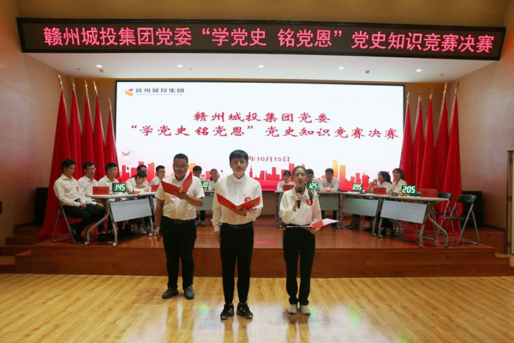 10月15日,贛州城投集團(tuán)黨委舉辦"學(xué)黨史 銘黨恩"黨史學(xué)習(xí)教育知識(shí)競(jìng)賽決賽。市國(guó)資委黨委黨史學(xué)習(xí)教育領(lǐng)導(dǎo)小組副組長(zhǎng)、黨委委員、副主任黃曉東,市委組織部組織三科科長(zhǎng)賴雯龍,市委黨史研究室正科級(jí)干部陳曄明,市委黨史研究室宣教科臨時(shí)負(fù)責(zé)人許偉卿應(yīng)邀到場(chǎng)指導(dǎo)。集團(tuán)黨委書記、董事長(zhǎng)提名人選劉曉方,集團(tuán)黨委副書記、總經(jīng)理提名人選郭閩軍及其他黨員高管出席活動(dòng)。來自集團(tuán)各黨支部(黨總支)的6支代表隊(duì)的參賽選手及黨員、群眾代表等共約90人參加。